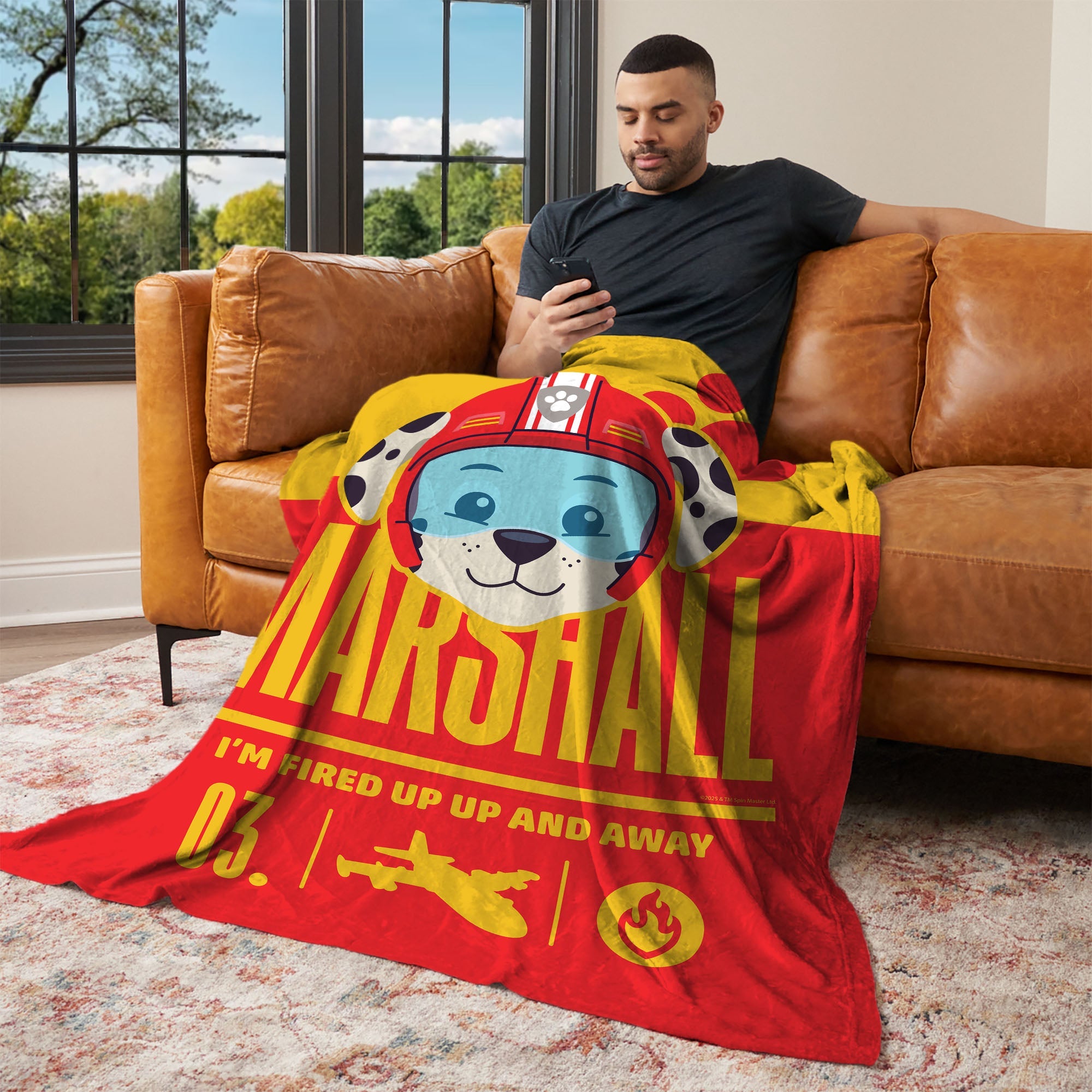Get fired up for fun with the Nickelodeon Paw Patrol "Marshall Fired Up" Silk Touch Throw Blanket. Featuring a vibrant design of Marshall in his red flight helmet with aviation-inspired icons and his catchphrase ¡°I¡¯m Fired Up Up and Away,¡± this blanket brings bold color and energy to any space. A bright red and yellow palette adds extra excitement for fans of the high-spirited pup. Made with luxuriously soft Silk Touch fabric, this blanket is perfect for cozying up on the couch, snuggling in bed, or keeping warm on road trips. Its lightweight feel and durable construction make it great for everyday use, whether at home or on the go. Perfect for Paw Patrol-themed rooms or cuddle-time adventures, this blanket is a must-have for kids who love action-packed missions and their favorite fired-up pup. It¡¯s a fun, functional piece that keeps young fans warm and smiling.