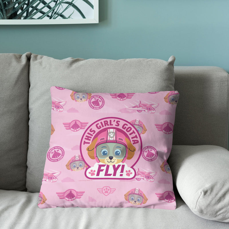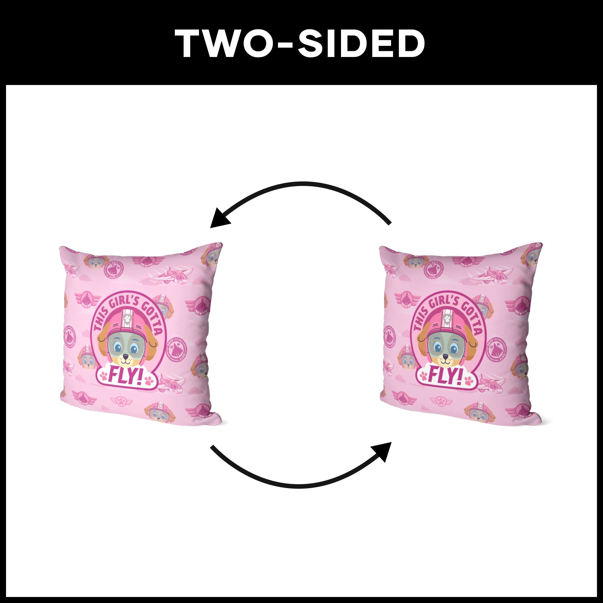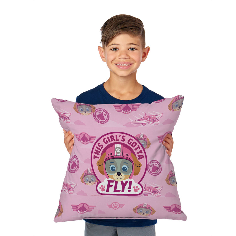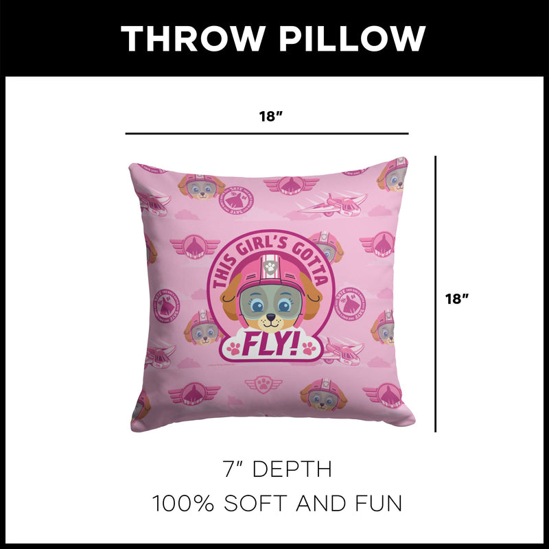 Take playtime to new heights with the Nickelodeon Paw Patrol "Skye Badge Pattern" Throw Pillow. Featuring Skye in her signature flight helmet and the bold phrase ¡°This Girl¡¯s Gotta Fly!,¡± this design is full of sky-ready energy and fearless style. A repeating background of airplanes, winged emblems, and cheerful clouds completes the aviation-themed look. Made from a soft-touch material and filled for maximum snuggle factor, this pillow offers cozy comfort during naps, bedtime, or quiet time. Whether it¡¯s decorating a bed or becoming a go-to cuddle companion, it¡¯s perfect for fans of the high-flying pup. Ideal for bedrooms, playrooms, or travel, this throw pillow brings girl-powered adventure wherever it lands. With vibrant pink tones and adorable artwork, it¡¯s a standout piece for kids who dream big and soar even higher.