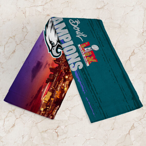 Show your team spirit and commemorate the biggest game of the year with this Philadelphia Eagles NFL Super Bowl ¡°Overview¡± Fan Towel 2 Pack. The first towel features the team logo, Super Bowl logo, team helmet, and an inside view of the stadium, bringing the excitement of game day to life. The second towel includes the team logo, Super Bowl logo, and a overhead view of New Orleans. Each design captures the essence of football's biggest event and the energy of its host city. Made from soft, durable materials, these towels are ideal for display or everyday use. Whether at home, in the office, or as part of your game-day gear, they add a touch of team pride and Super Bowl excitement to any setting. Lightweight and absorbent, they are practical yet stylish additions to any football fan's collection.