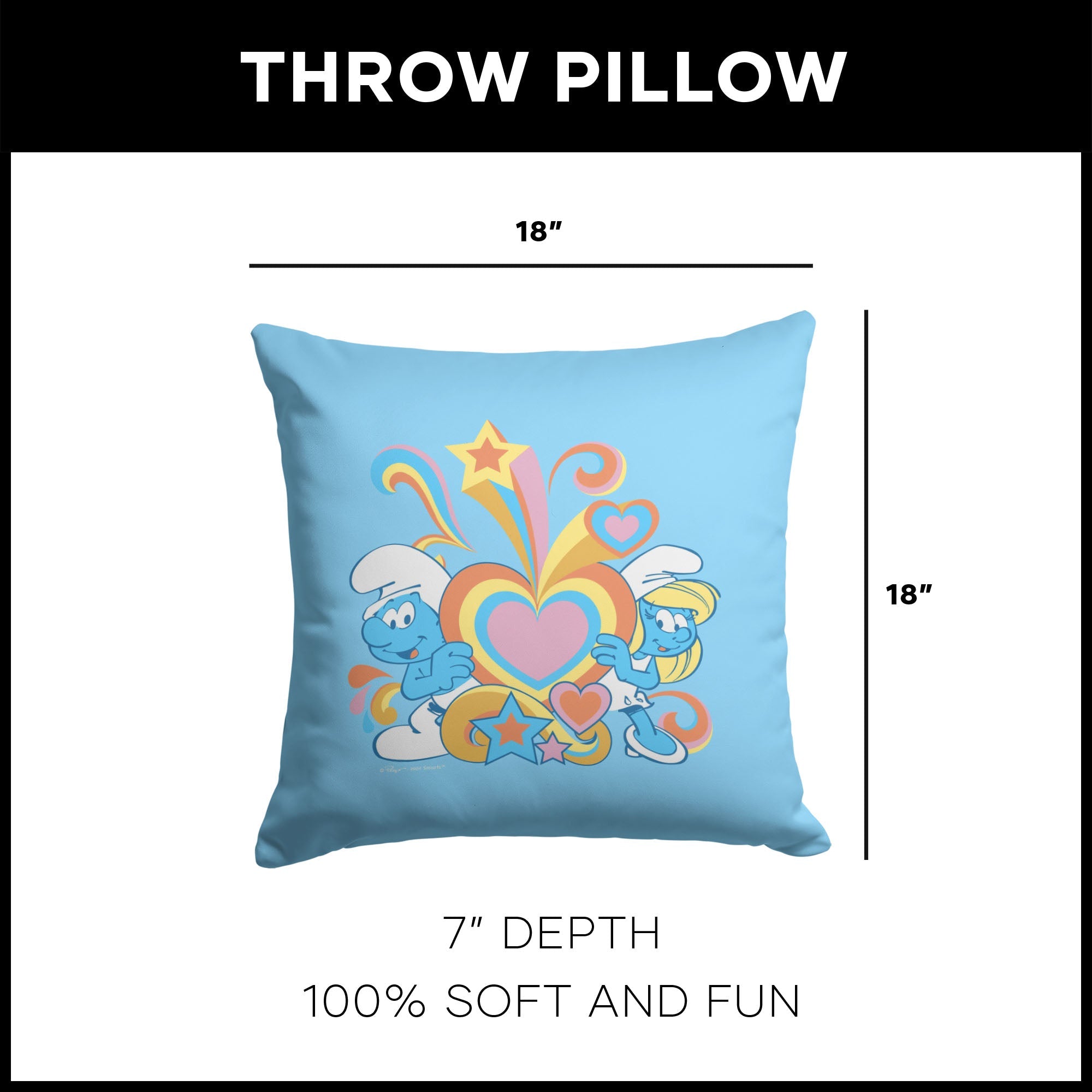 Spread good vibes and big smiles with the Paramount Smurfs ¡°Groovy Smurfs¡± Silk Touch Throw Pillow, featuring two playful Smurfs showing off a giant retro heart bursting with colorful swirls, stars, and 70s-inspired shapes on a bright sky-blue backdrop. Inspired by the cheerful, carefree fun of classic Smurfs adventures, this pillow brings a burst of nostalgia and happy energy to any room, instantly transforming your bed, couch, or reading nook into a fun-loving, feel-good retreat. The silky-soft fabric adds an extra layer of comfort, making it just right for movie marathons, afternoon naps, or simply adding a pop of groovy charm to your d¨¦cor. Whether you¡¯re a lifelong Smurfs fan or just love a playful retro vibe, this pillow is the perfect snuggle buddy for spreading love, color, and Smurfy smiles every day.