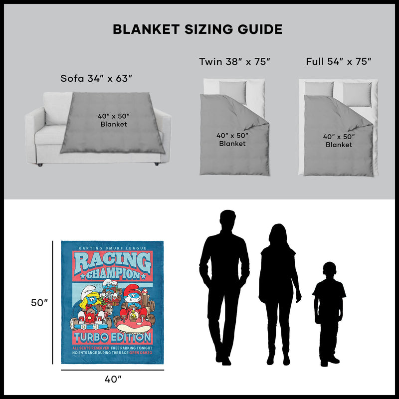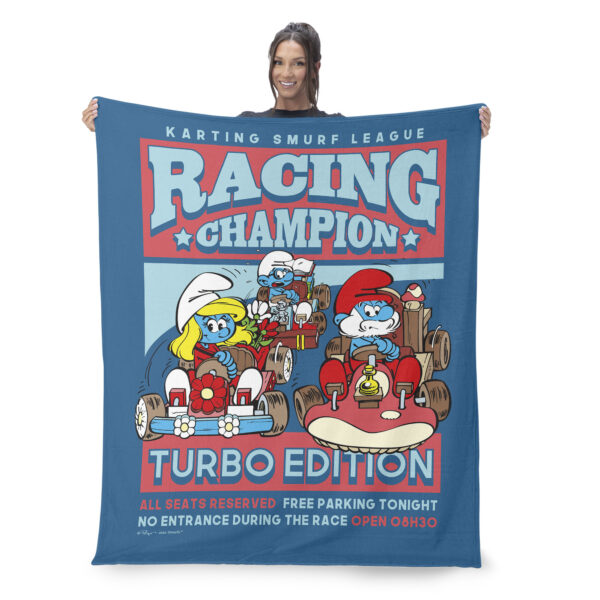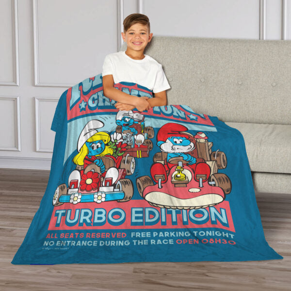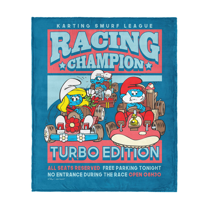 Race into fun with the Paramount Smurfs ¡°Smurf Racing¡± Silk Touch Throw Blanket. Featuring Smurfette, Papa Smurf, and other Smurfs in a high-speed karting competition, this design captures the thrill of the ¡°Karting Smurf League¡± Turbo Edition. With vibrant colors and playful details, the blanket showcases the Smurfs in their racing karts, complete with flowers, trophies, and the lively event details like ¡°Free Parking Tonight¡± and ¡°No Entrance During the Race.¡± Made from ultra-soft fabric, this throw brings the excitement of Smurf karting right into your living room. Cozy and stylish, this throw blanket is perfect for adding a pop of color and charm to any room. Whether you¡¯re snuggling up after a race or enjoying a Smurfs marathon, it offers both warmth and a cheerful atmosphere. The detailed design, with its bright blues, reds, and yellows, ensures it stands out as both a practical accessory and a fun decor piece. Ideal for Smurfs fans or anyone who loves playful and energetic designs, this throw blanket is a great gift or personal treat. Whether you use it to cozy up during a karting-themed movie night or to brighten up your fan cave, it¡¯s sure to bring smiles and excitement to your home. Let the Smurfs race into your space with this lively, turbo-charged throw blanket.