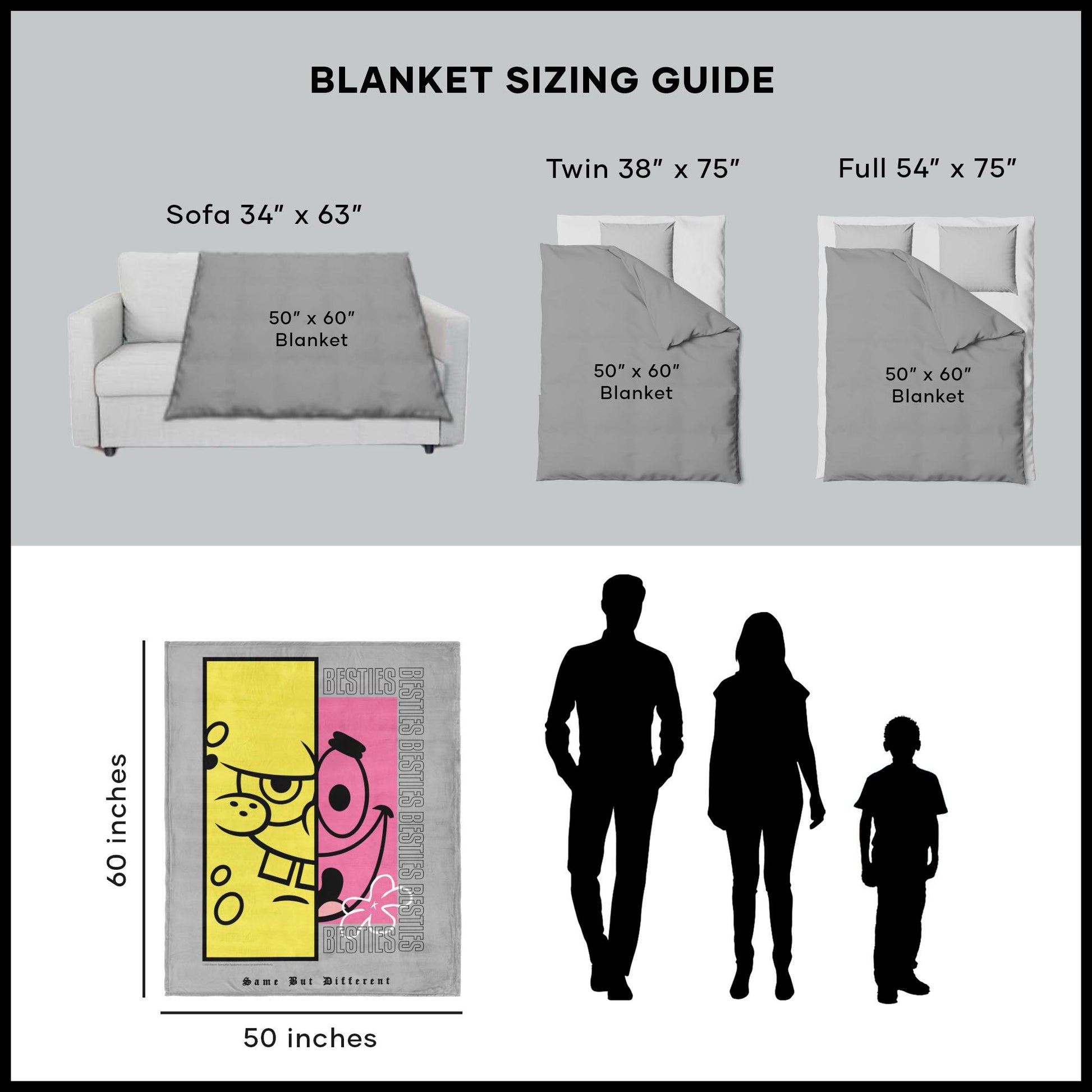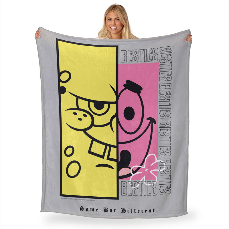 Experience the ultimate friendship with the Nickelodeon SpongeBob "Besties" Silk Touch Throw! This vibrant throw features a close-up split image of SpongeBob on the left and Patrick on the right, celebrating their unique friendship. The words "Same but Different" at the bottom add a playful touch, highlighting the special bond between these iconic characters. Made from luxurious silk touch fabric, this throw is not just a blanket but a statement piece that adds a pop of color and fun to any room. Whether you're lounging on the couch or adding a touch of SpongeBob whimsy to your bedroom, this throw is sure to delight fans of all ages.