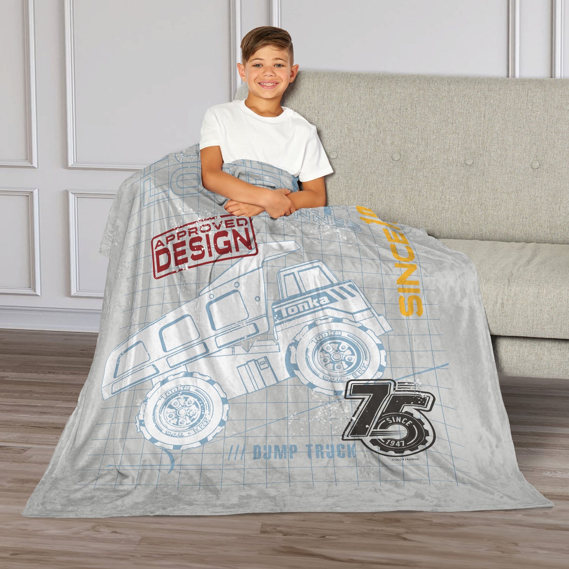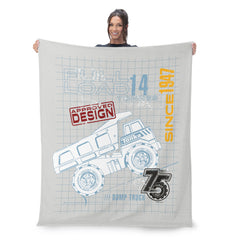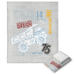 The Hasbro Tonka "Full Truckload" Silk Touch Throw Blanket showcases a design of a Tonka dump truck set against a unique graph paper background, complete with an "Approved Design" stamp. This fun and creative layout highlights the process behind the iconic trucks, capturing the essence of Tonka¡¯s dedication to quality and imagination. The bold truck illustration stands out, making it a perfect piece for any Tonka fan. Whether you¡¯re snuggling up or decorating your space, this blanket is sure to make a statement.