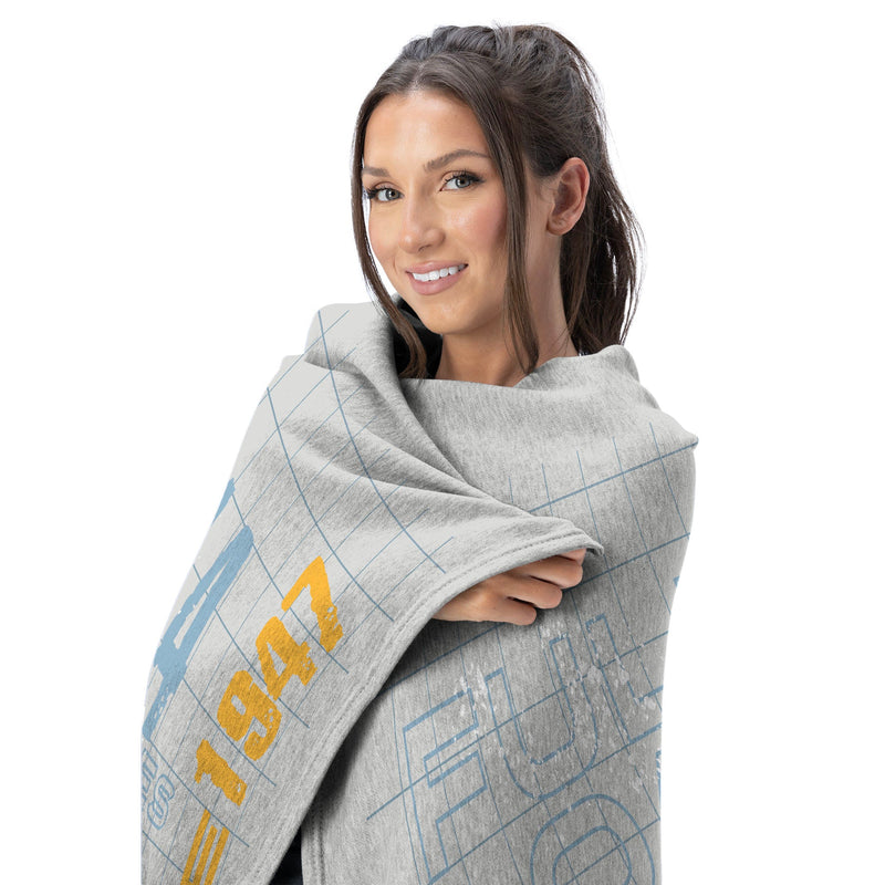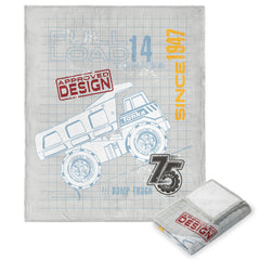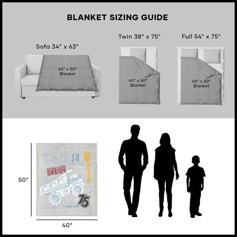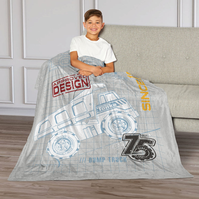 The Hasbro Tonka "Full Truckload" Silk Touch Throw Blanket showcases a design of a Tonka dump truck set against a unique graph paper background, complete with an "Approved Design" stamp. This fun and creative layout highlights the process behind the iconic trucks, capturing the essence of Tonka¡¯s dedication to quality and imagination. The bold truck illustration stands out, making it a perfect piece for any Tonka fan. Whether you¡¯re snuggling up or decorating your space, this blanket is sure to make a statement.