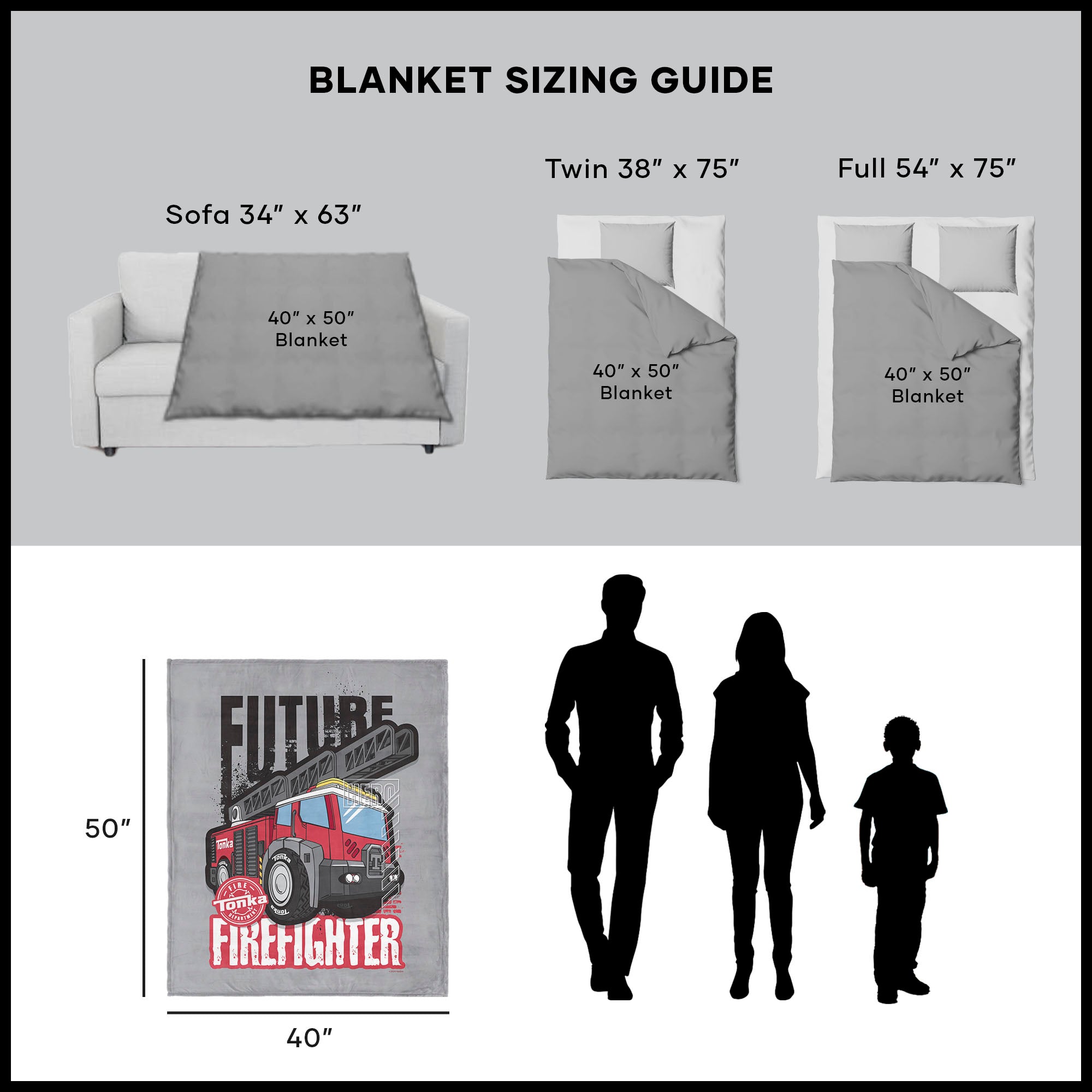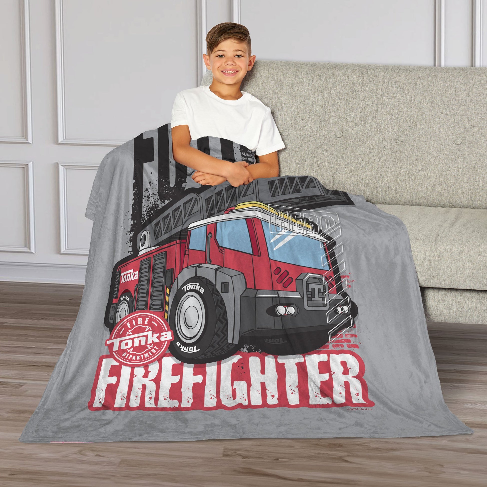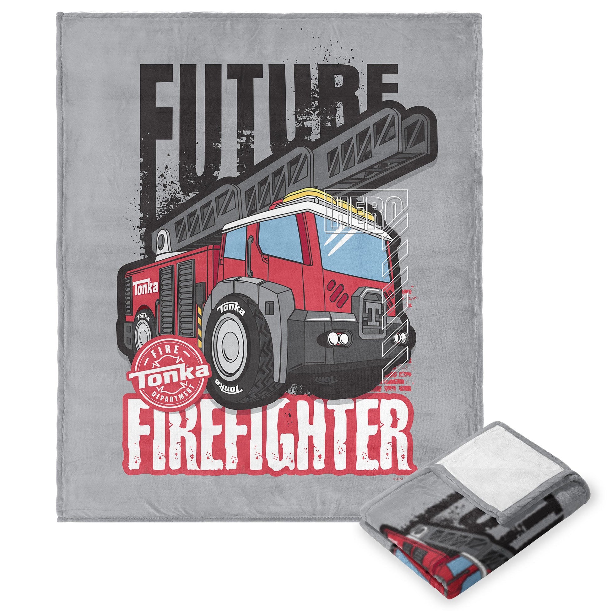 Gear up for action with the Hasbro Tonka "Future Firefighter" Silk Touch Throw Blanket. This soft and cozy blanket showcases a bold Tonka Ladder Truck, standing tall and ready for any rescue mission. Against a sleek grey background, the truck's vivid red color makes it pop, giving any room a little extra excitement. Perfect for young dreamers, the words "Future Firefighter" inspiring bravery and imagination. Whether they're saving the day or relaxing after a long day of play, this blanket keeps them wrapped up in their favorite adventure.