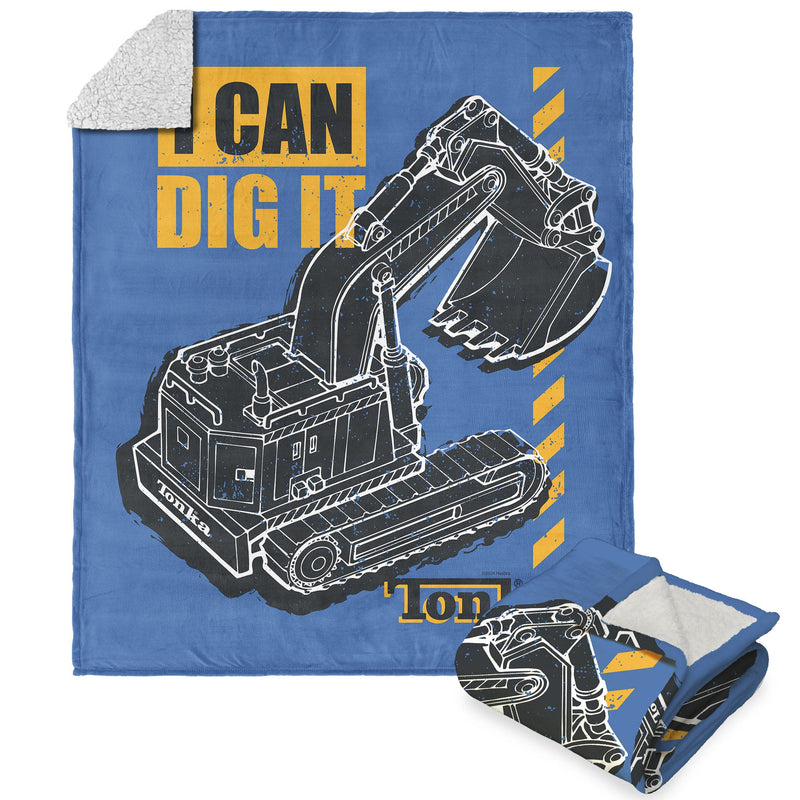 Get ready to dig into comfort with the Hasbro Tonka "I Can Dig It" Silk Touch Sherpa Throw Blanket. Featuring a bold black-and-white illustration of a mighty Tonka Trencher, this blanket is perfect for little builders and Tonka fans of all ages. The powerful design paired with soft, silky fabric makes this a standout piece for any playroom or bedroom. Add a touch of adventure to daily routines. This Tonka throw is the perfect companion for winding down after a busy day of building, digging, or just relaxing on the couch.