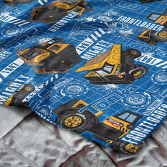 - Features an energetic, repeating pattern of Tonka construction trucks against a vibrant blue background