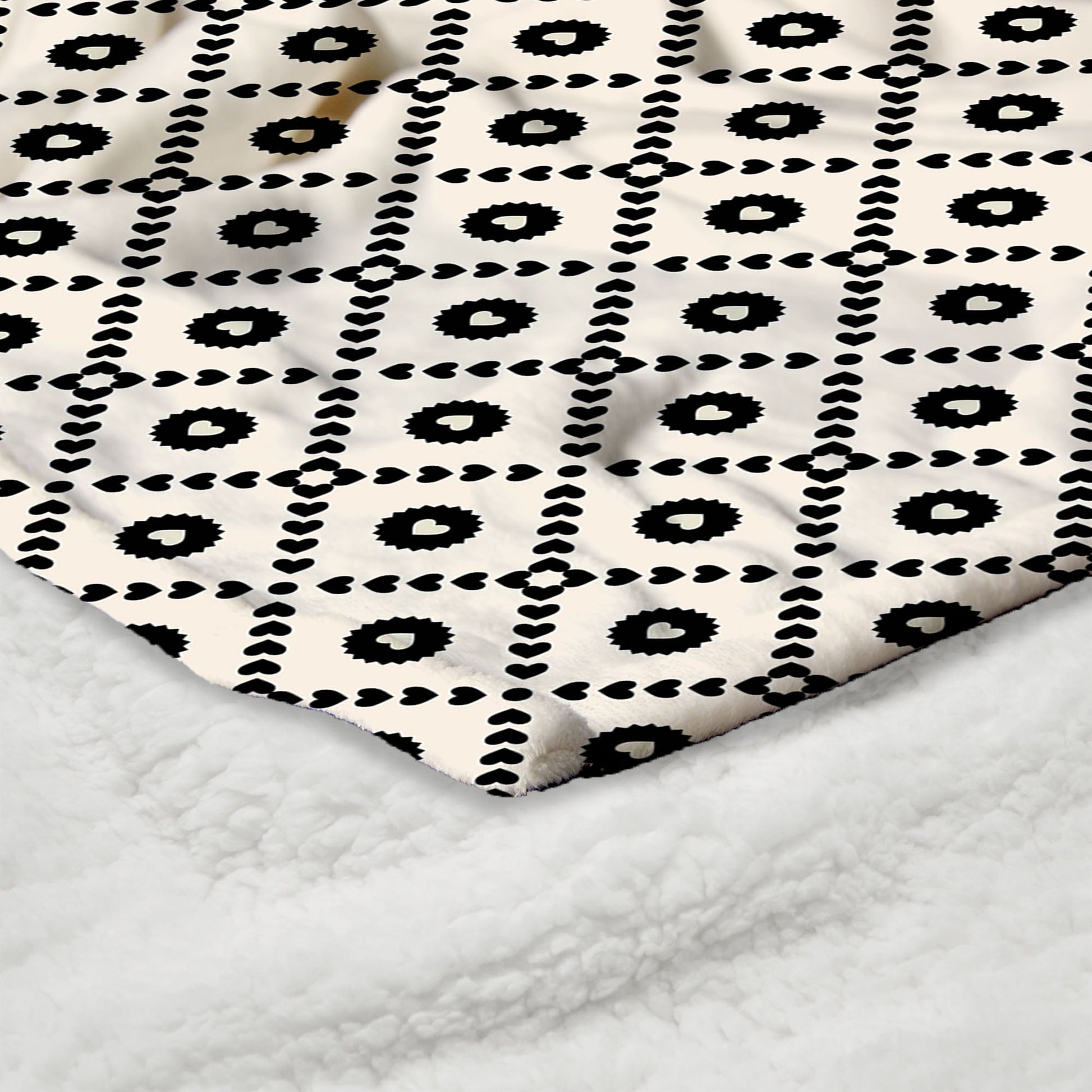 ? Featuring a striking geometric pattern adorned with repeating black hearts.