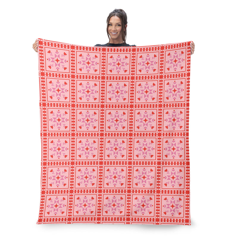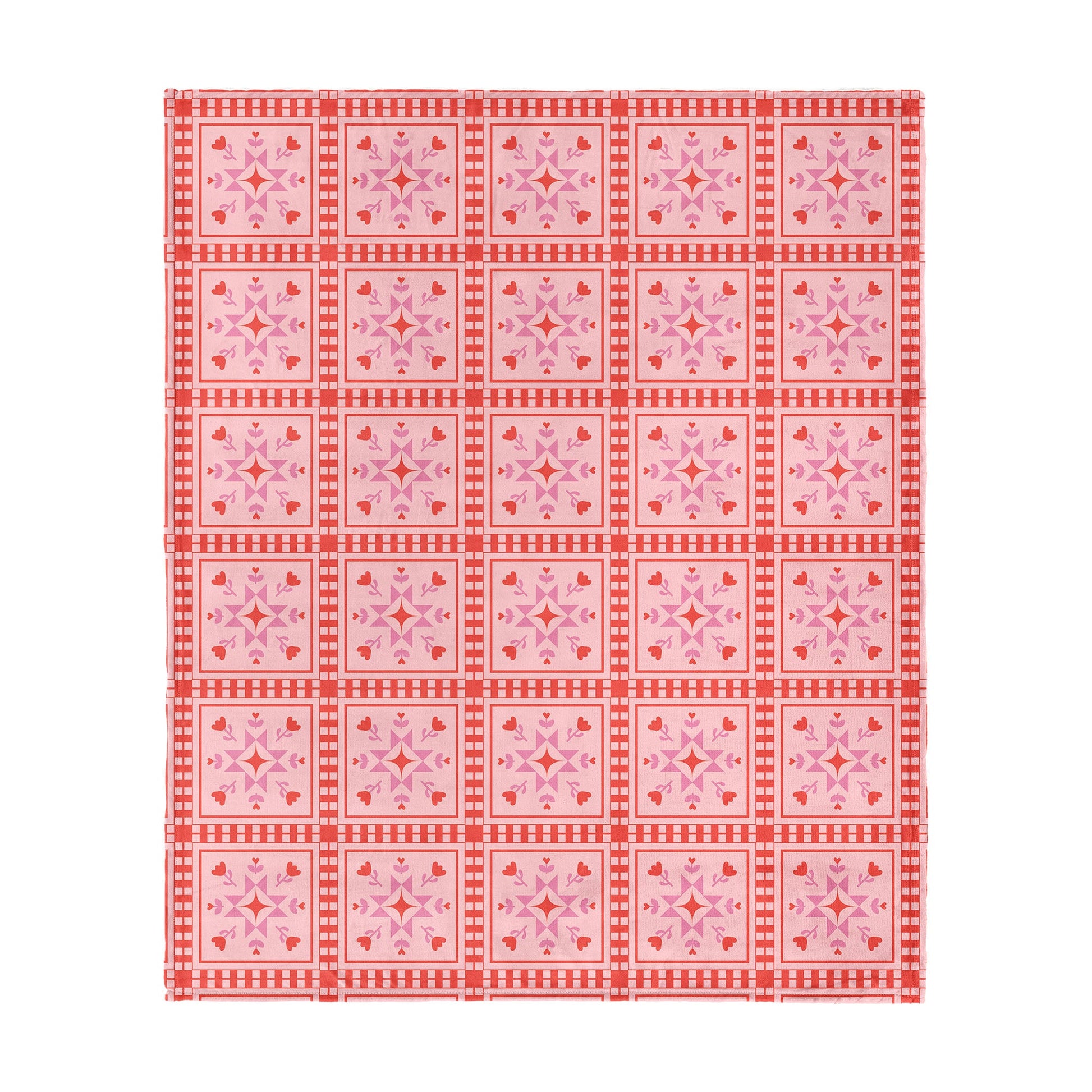Warm up your space with a design that blends timeless charm and modern flair. This throw blanket showcases a stunning geometric pattern in rich reds and pinks, accented by delicate red flowers that evoke the classic look of quilted artistry. Each detail brings a sense of love and coziness, perfect for creating an inviting ambiance. Whether it¡¯s a gift for someone special or a treat for yourself, this blanket is a stylish addition to any room. The intricate pattern and harmonious colors make it as visually delightful as it is comforting, enhancing your Valentine¡¯s Day celebrations or everyday moments with a touch of warmth. Lightweight yet luxuriously soft, it¡¯s perfect for snuggling on the couch, adding a decorative touch to your bed, or simply enjoying a moment of relaxation. Its unique design ensures it stands out as a beautiful accent while delivering unparalleled comfort.