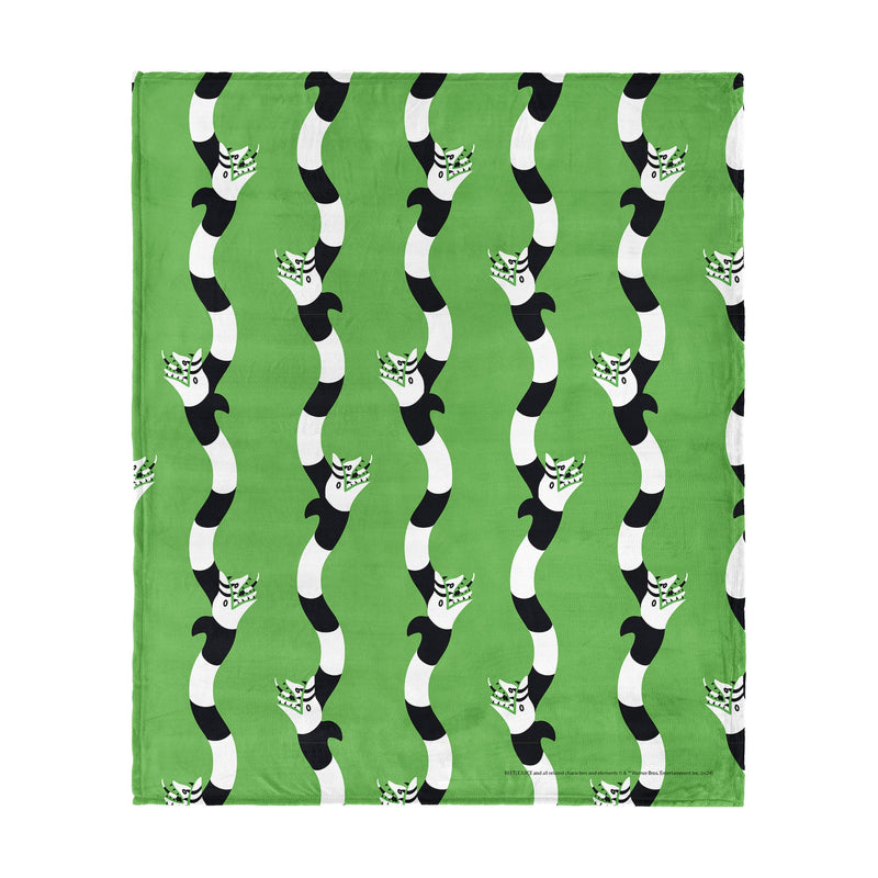 Step into a world of chaos with the Beetlejuice ¡°No Rules¡± Silk Touch Throw Blanket. Featuring a striking black-and-white illustration of interconnected sandworms slithering in vertical lines, this design captures the wild and unpredictable spirit of Beetlejuice. Set against a vibrant green background, it adds a playful twist to the eerie world of the ghost with the most. Whether draped over your favorite chair, bed, or simply used for some extra warmth, this sandworm-themed blanket brings bold style to any space. Crafted from ultra-soft, silky fabric, this throw blanket delivers comfort while embracing your love for all things strange and unusual. The smooth texture makes it perfect for curling up on the couch or adding a touch of spooky fun to your everyday routine.