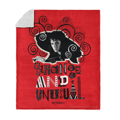 Embrace the wonderfully weird with the Beetlejuice ¡°So So Strange¡± Silk Touch Sherpa Throw Blanket. This eye-catching design features a bold black-and-white illustration of Lydia, perfectly complemented by the whimsical phrase ¡°Strange and Unusual¡± in a playful font filled with fun graphics. The vibrant red background makes the artwork pop, capturing the unique charm of this beloved character. The luxurious texture adds a touch of indulgence, ensuring you stay snug while celebrating your love for all things Beetlejuice. Perfect for adding a splash of personality to your decor, this blanket is as versatile as it is stylish. Whether you drape it over your couch, use it on your bed, or take it along for an adventure.