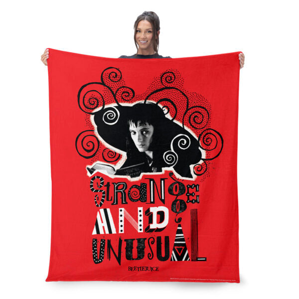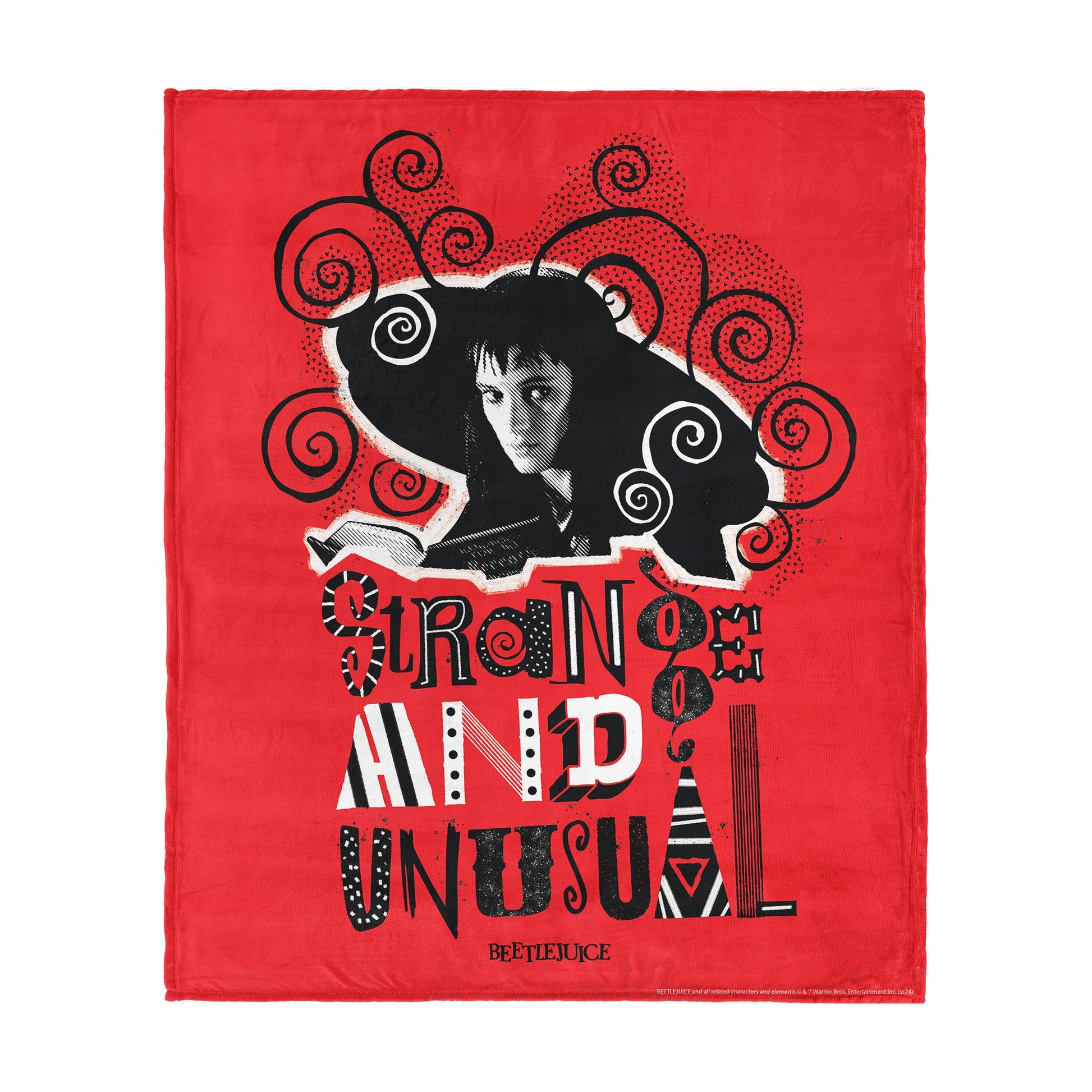 Embrace the wonderfully weird with the Beetlejuice ¡°So So Strange¡± Silk Touch Throw Blanket. This eye-catching design features a bold black-and-white illustration of Lydia, perfectly complemented by the whimsical phrase ¡°Strange and Unusual¡± in a playful font filled with fun graphics. The vibrant red background makes the artwork pop, capturing the unique charm of this beloved character. The luxurious texture adds a touch of indulgence, ensuring you stay snug while celebrating your love for all things Beetlejuice. Perfect for adding a splash of personality to your decor, this blanket is as versatile as it is stylish. Whether you drape it over your couch, use it on your bed, or take it along for an adventure.