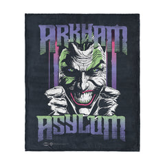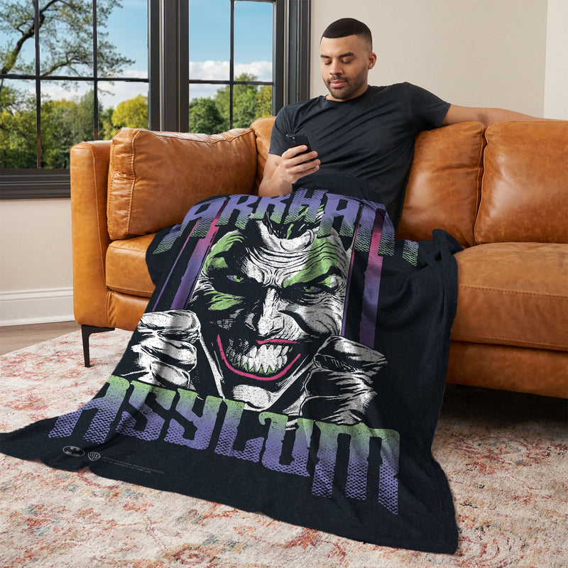 Step into the twisted world of Gotham with this DC Arkham Asylum Silk Touch Throw Blanket. Featuring a bold graphic of the Joker¡¯s head paired with the words ¡°Arkham Asylum,¡± it captures the chaos and unpredictability of one of DC¡¯s most iconic villains. Made from ultra-soft silk-touch fabric, this blanket offers a smooth, lightweight feel perfect for staying cozy. Whether you¡¯re diving into your favorite Batman stories or adding a touch of Gotham-inspired style to your space, it¡¯s the ultimate combination of comfort and edge. A must-have for fans of the Joker and the dark corners of Gotham, this throw blanket is a striking addition to any room. Let it bring a hint of madness and a lot of warmth to your next movie night or reading session.
