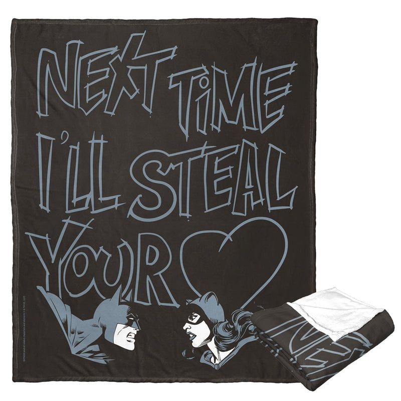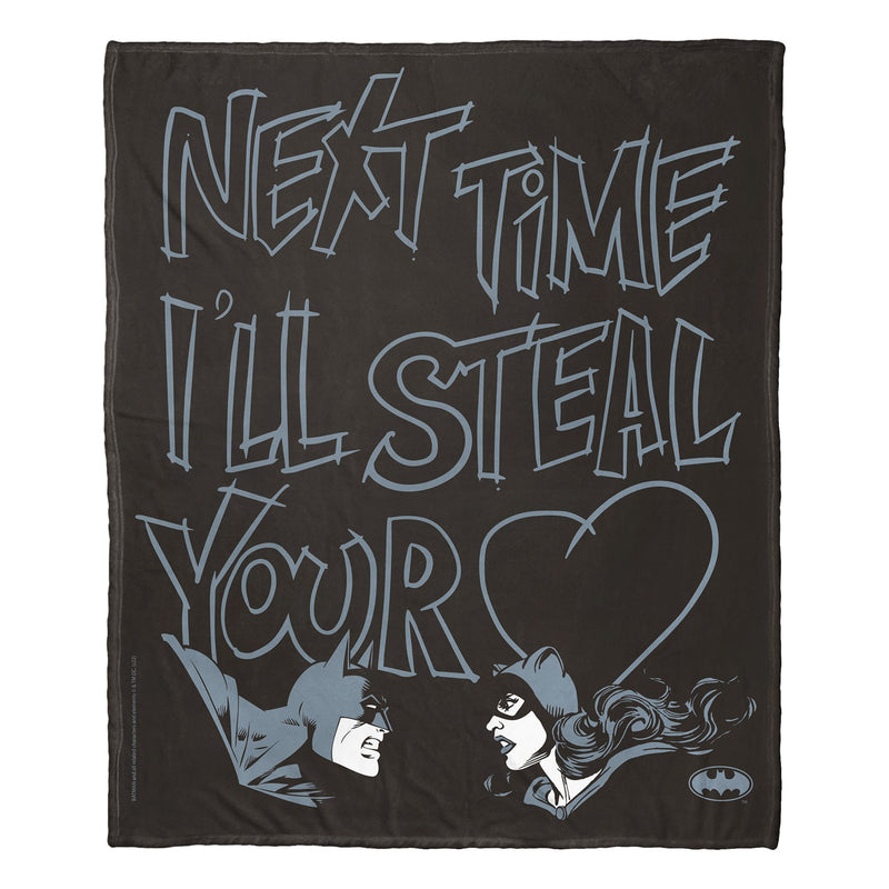 - Features a graphic style illustration of Batman and Cat Woman wiht the words "Next Time I'll Steal Your Heart" above them