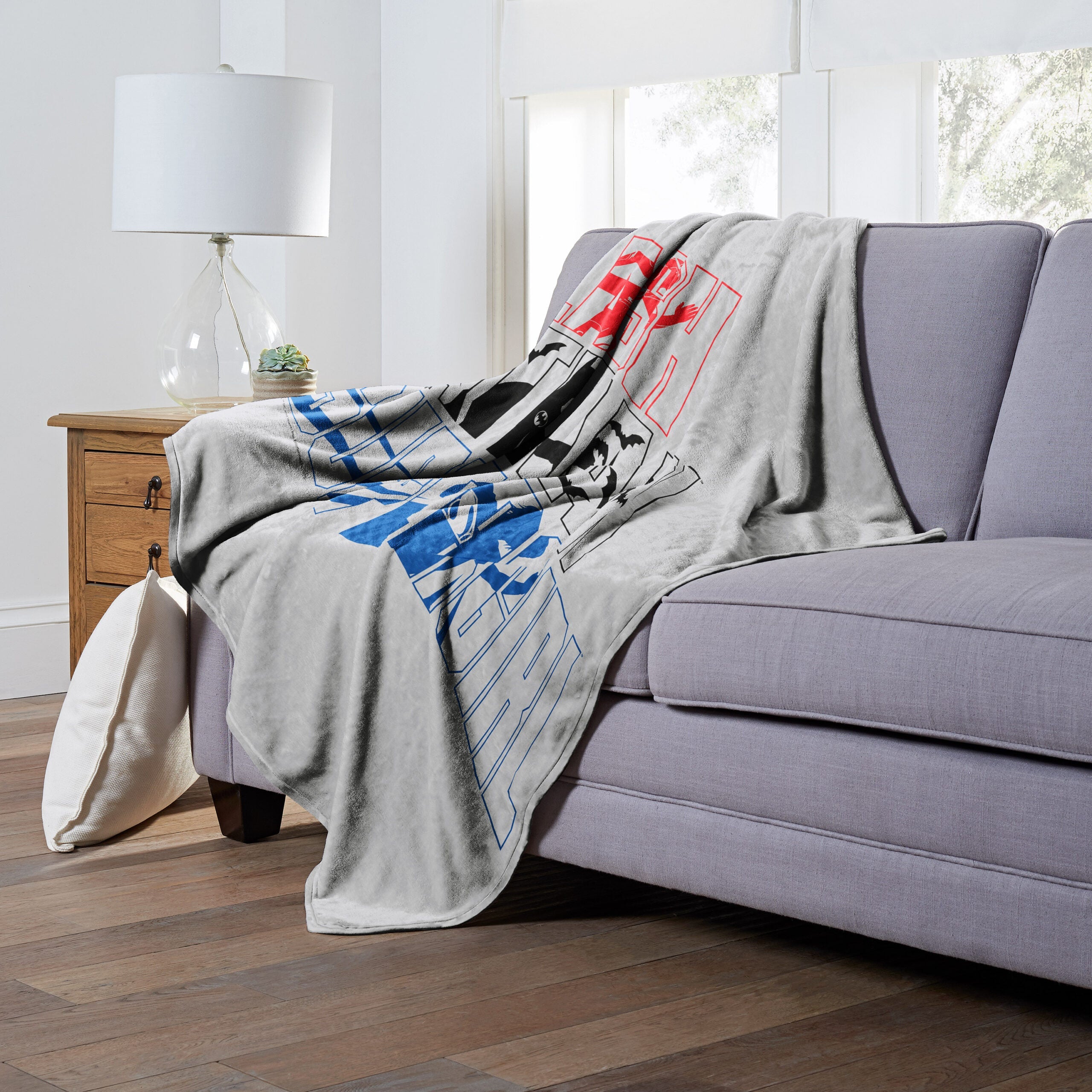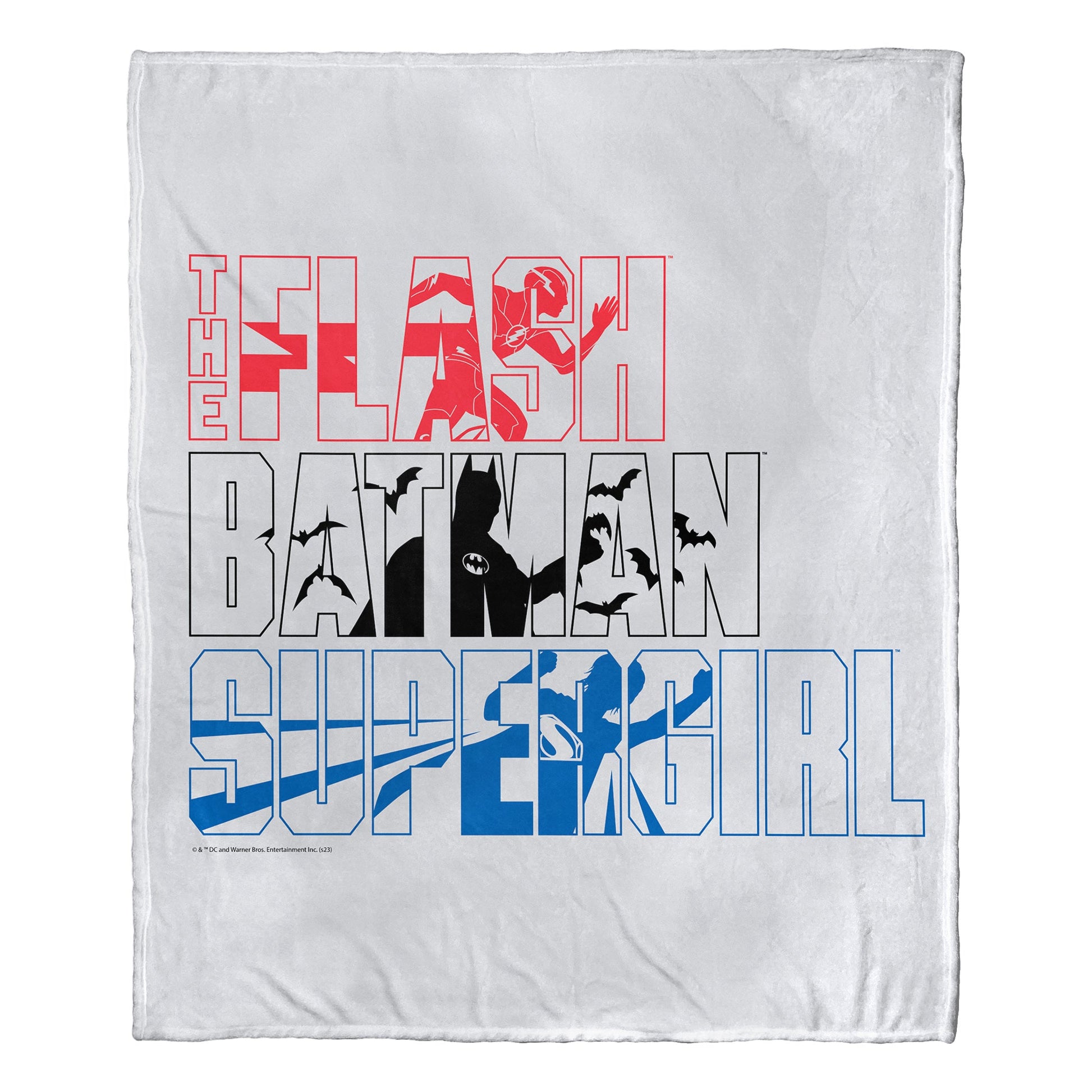 - Features graphic images of The Flash, Batman and Supergirl inside their transparent outlined names