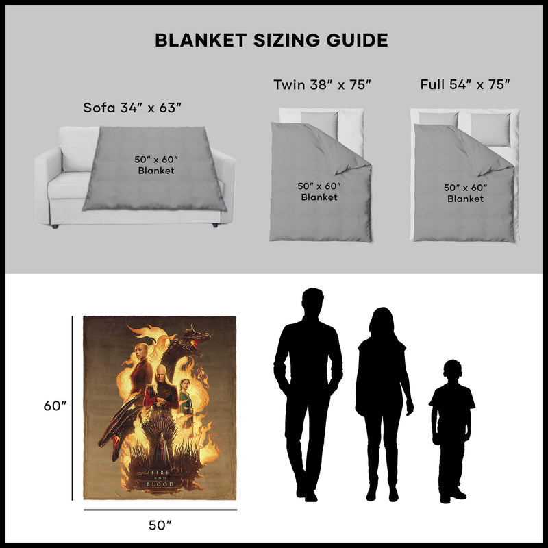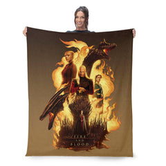 Immerse yourself in the intrigue of Westeros with the House of the Dragon ¡°Fire and Blood Reigns¡± Silk Touch Sherpa Throw Blanket. Featuring Daemon Targaryen, Princess Rhaenyra, and Alicent Hightower set against a golden-brown backdrop, this design reflects the tension and power struggles at the heart of the Targaryen dynasty. This blanket provides lightweight warmth and a luxurious feel. Perfect for cozying up while watching your favorite episodes or adding a dramatic touch to your home, it¡¯s a stunning representation of House Targaryen¡¯s legacy. For fans of House of the Dragon, this throw captures the allure and intensity of the characters who shaped the realm. Add this to your collection as a striking tribute to fire, blood, and the battle for the Iron Throne.