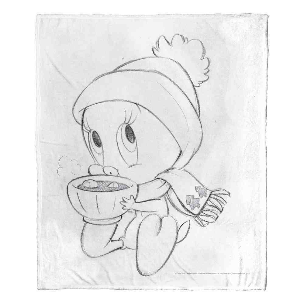 - Features a black and white illustrated drawing of Tweety Bird sipping a cup of cocoa