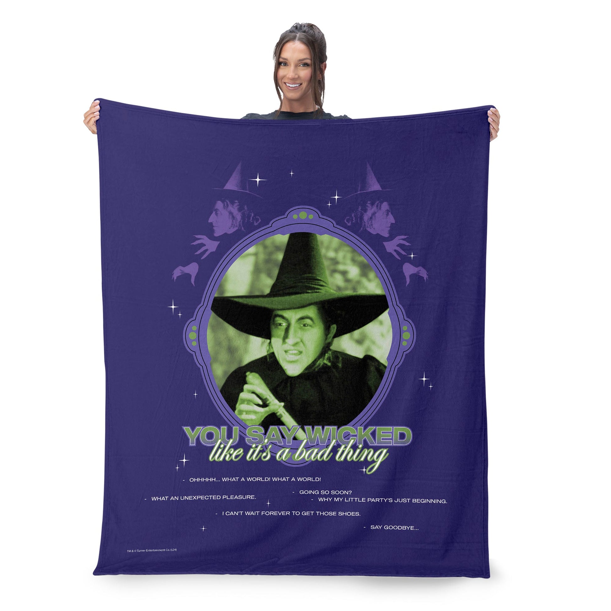 Embrace the darker side of Oz with the Warner Bros. The Wizard of Oz ¡°Wicked Bad¡± Silk Touch Throw Blanket. Featuring the iconic Wicked Witch in all her glory, this blanket showcases some of her most famous lines beneath her fierce image. This throw brings her wickedness to life in a fun, stylish way. Perfect for fans of the classic film, this throw adds a touch of magic and mischief to any room. The bold design captures the Wicked Witch¡¯s unforgettable presence, making it an excellent addition to your collection of Wizard of Oz memorabilia. Ideal for those cozy moments when you want to relax and enjoy a bit of Oz-inspired charm, this throw blends humor with comfort. Bring home a piece of wickedness and let the blanket¡¯s vibrant colors and sharp details create an enchanting atmosphere in your home.