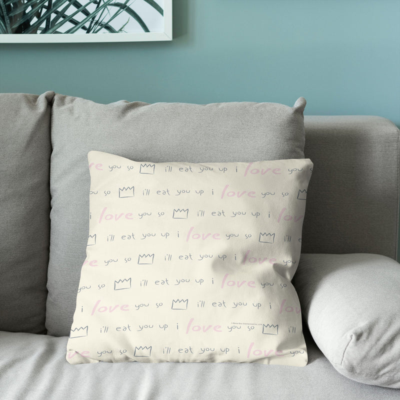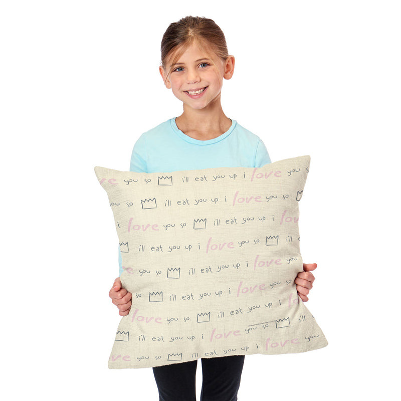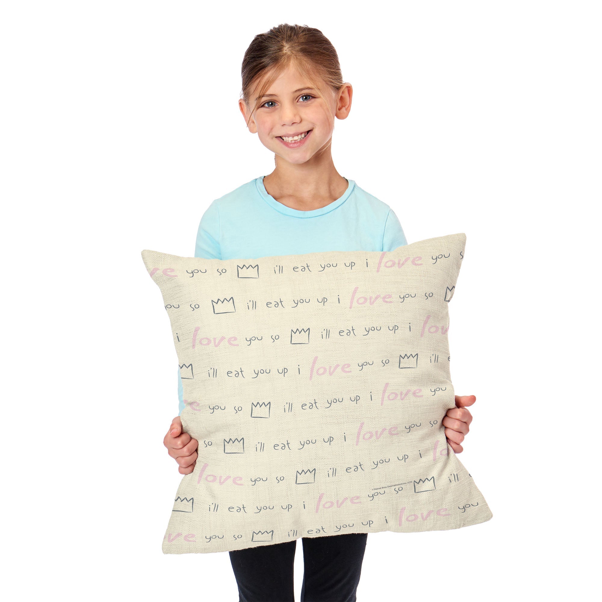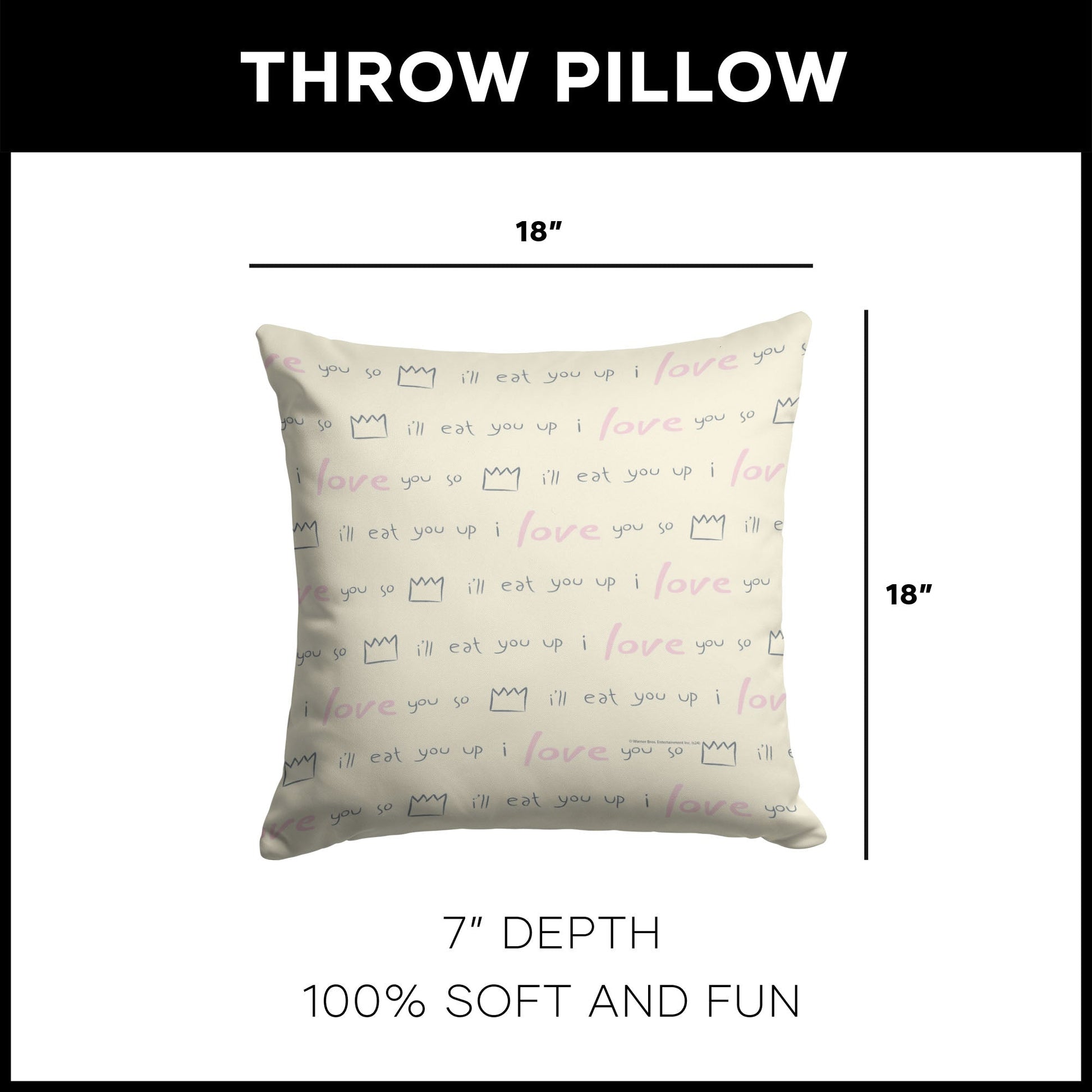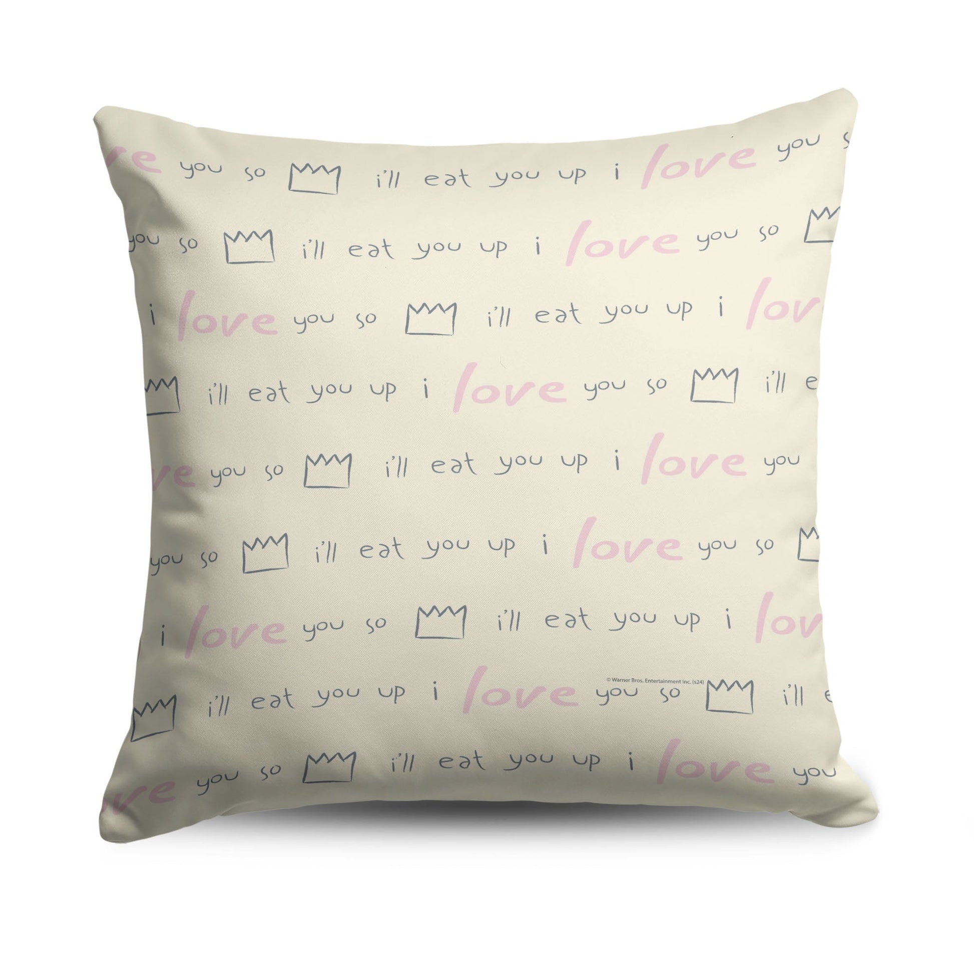 Add a dash of wild charm to your space with the Warner Bros. Where the Wild Things Are ¡°We¡¯ll Eat You Up¡± Throw Pillow. Featuring the words, ¡°We¡¯ll Eat You Up, We Love You So,¡± this design beautifully captures the playful and loving nature of the Wild Things. At the bottom, the top of a monster¡¯s head peeks out, adding a fun and whimsical touch that brings the story to life in your home. This cozy pillow invites a sense of warmth and imagination into any room. Whether placed on your couch, bed, or favorite chair, its vibrant colors and fun design bring a smile every time you see it. The combination of playful text and the monster¡¯s mischievous face adds an element of both comfort and adventure to your decor. For fans of Where the Wild Things Are, the ¡°We¡¯ll Eat You Up¡± Throw Pillow is a perfect addition. Max¡¯s wild journey and loving connection with the Wild Things are captured in this lighthearted design, transforming your space into a whimsical retreat filled with love and adventure.