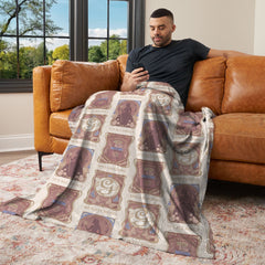 ? Oversized; super soft, silk touch fabric front; plush, neutral color sherpa back; decorative binding around all edges