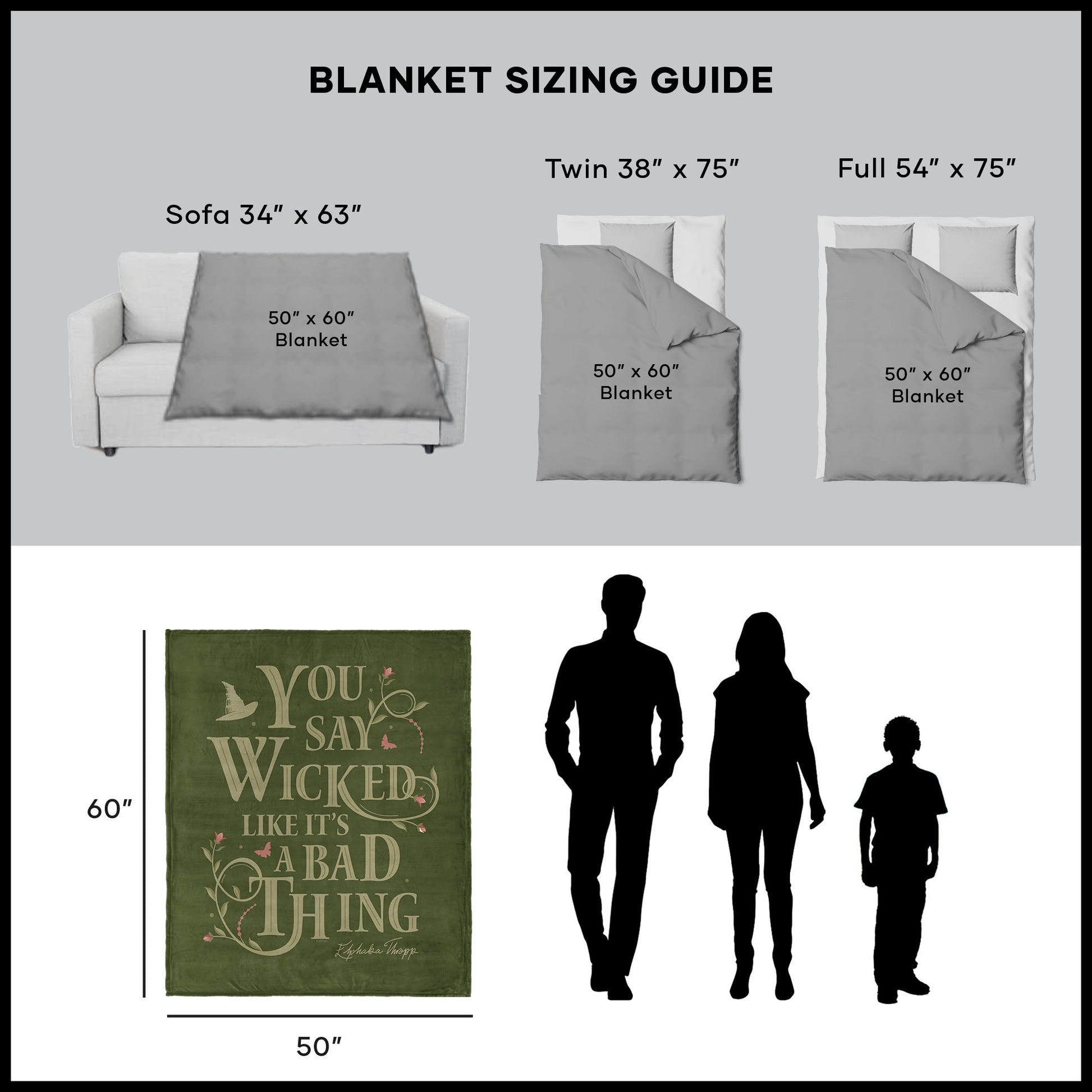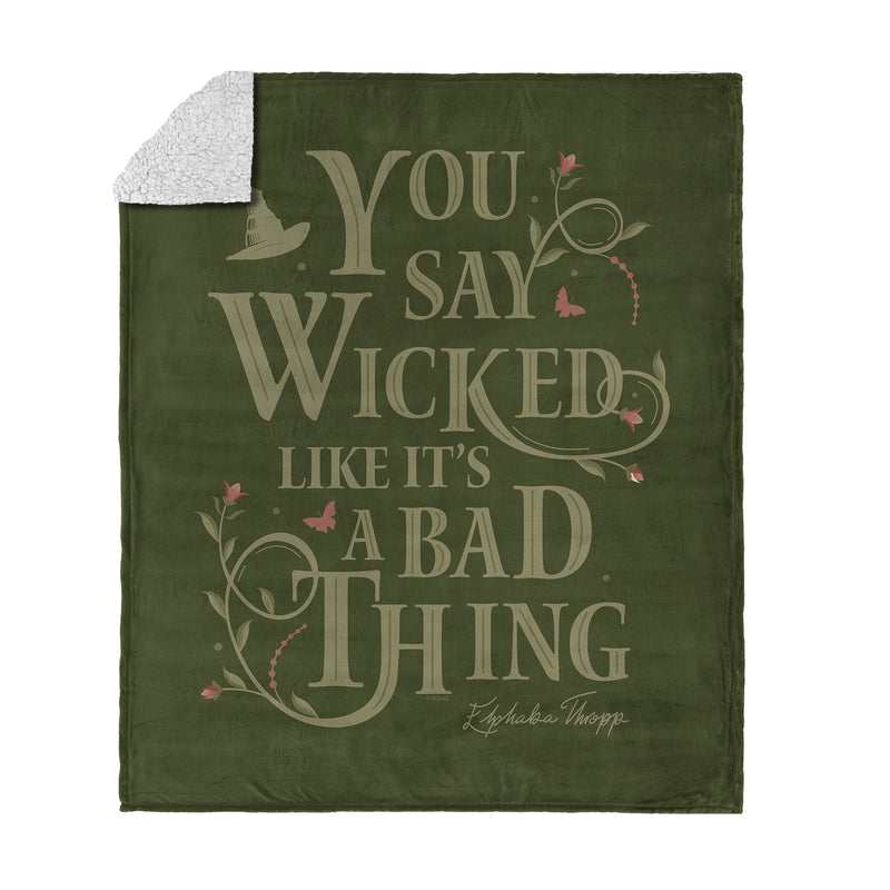 Make a bold statement with the Universal Wicked ¡°Say Wicked¡± Silk Touch Sherpa Throw Blanket, featuring Elphaba Thropp¡¯s iconic quote ¡°You Say Wicked Like It¡¯s a Bad Thing¡± in elegant lettering, accented by pink flowers, curling vines, butterflies, and her classic witch hat. Inspired by the fearless spirit of Wicked¡¯s legendary witch, this blanket reminds you to embrace your power, stand out, and own your story¡ªno matter how unconventional it may be. Perfect for draping across your bed, favorite reading chair, or sofa, it brings a touch of rebellion and soft, cozy comfort to any space where you want to feel wonderfully wicked.