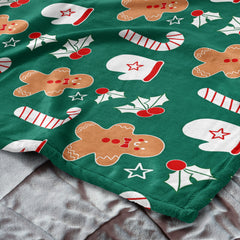 - Features a playful design of mistletoe, candy canes, gingerbread men, and mittens on a vibrant green background.